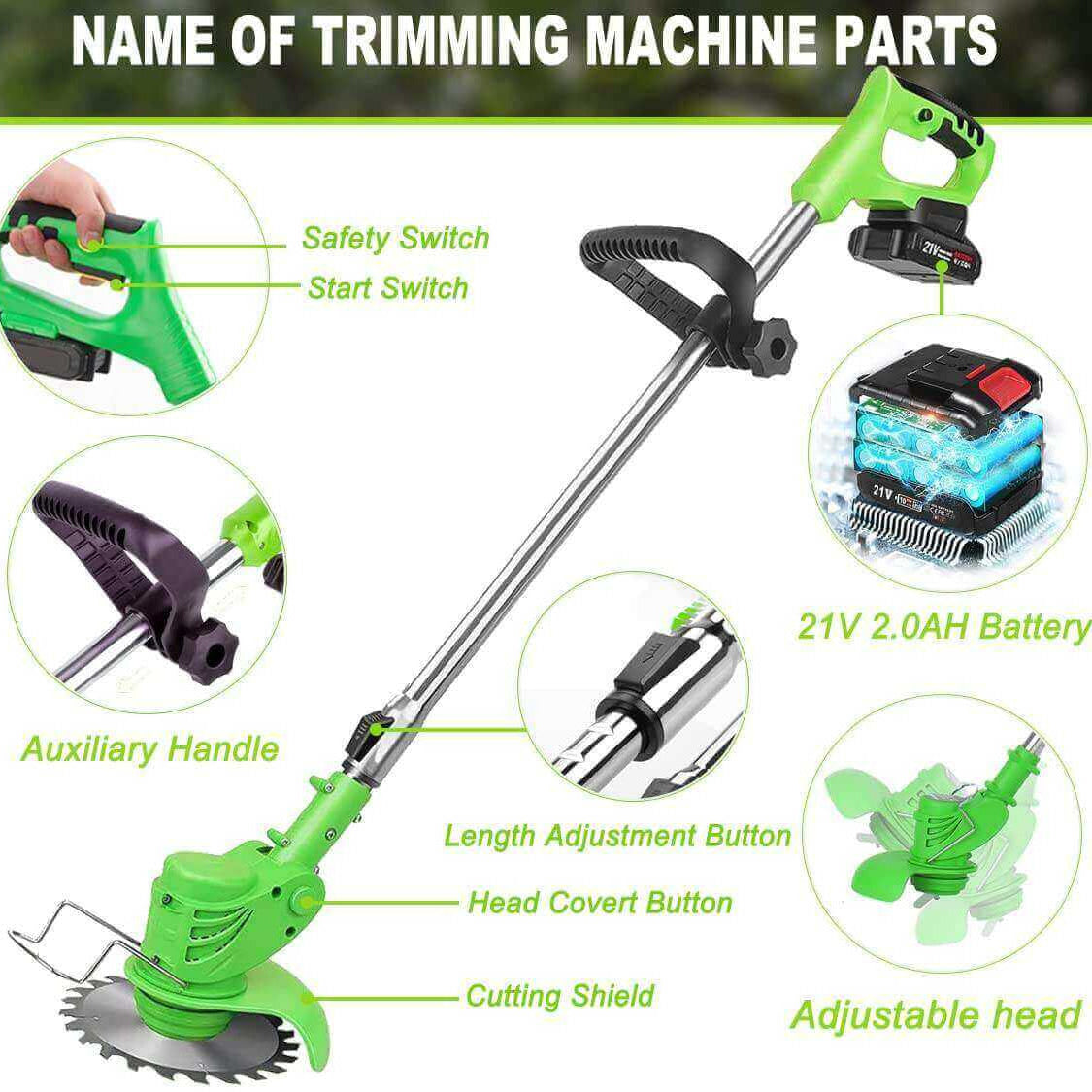 Equipped with two rechargeable 21V batteries and a fast charger, this trimmer delivers long-lasting performance — perfect for home gardeners and DIY users who want pro results without the noise or gas mess.
