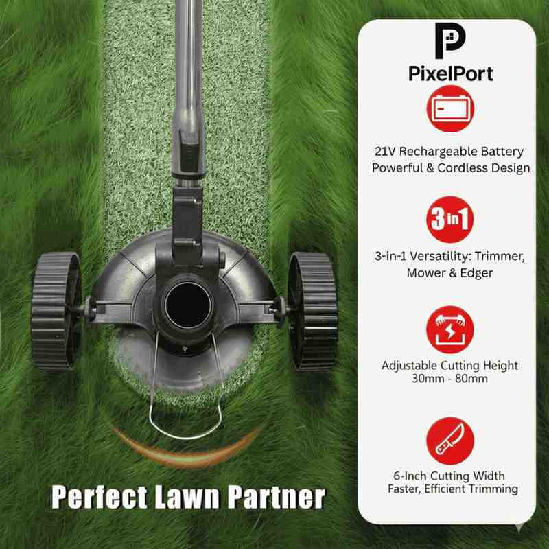 Powered by a 21 V rechargeable battery, this versatile garden tool easily transforms from a weed trimmer to a wheeled lawn mower or precision edger. Its cordless and lightweight design lets you move freely while maintaining your lawn with ease. The adjustable cutting height (30 mm – 80 mm) and 6-inch cutting width make trimming faster and more efficient — helping you finish your yard work in less time and with less effort.
