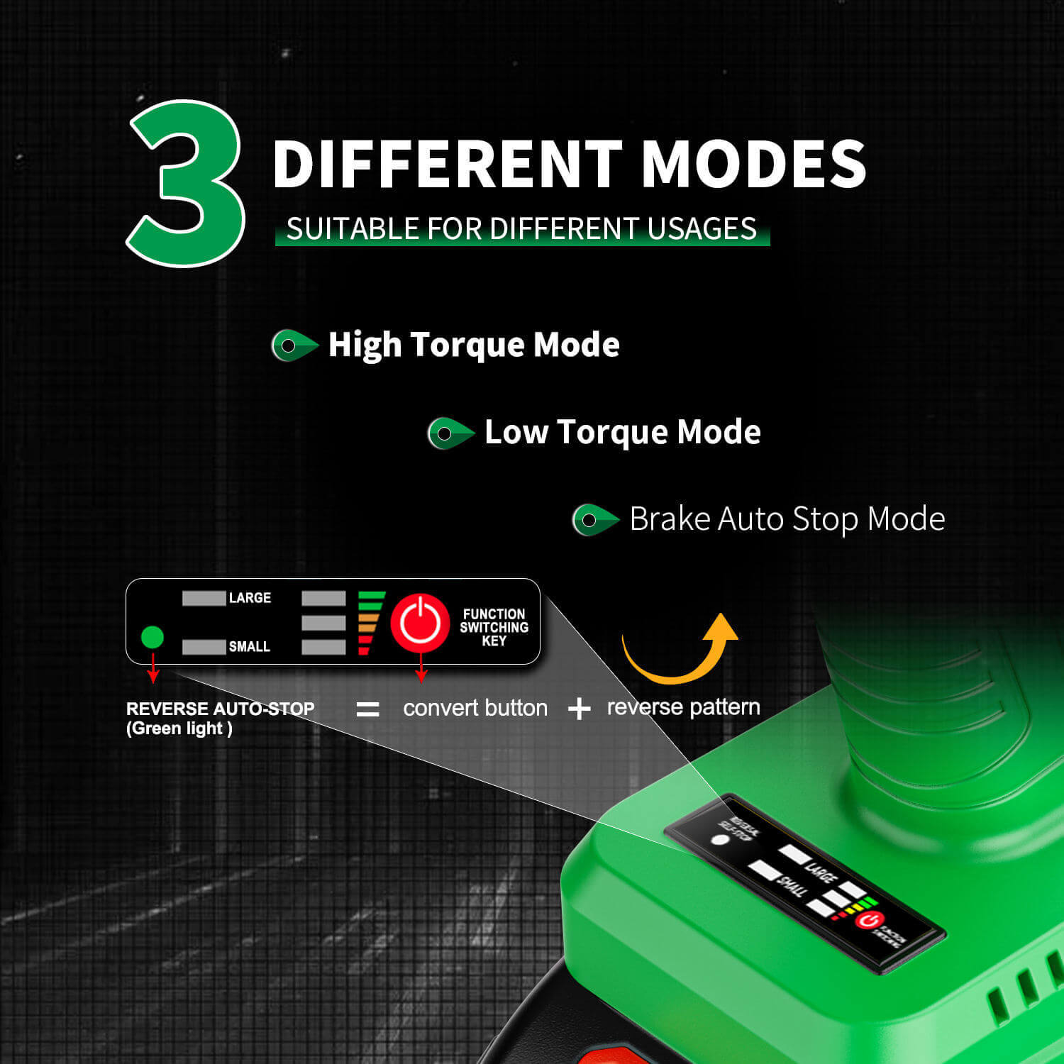 Equipped with 3 adjustable speed modes, reverse auto-stop, and a variable speed trigger, this wrench gives you full control in every application. The LED work light ensures visibility in dark areas, while the soft ergonomic handle provides comfort during long use.