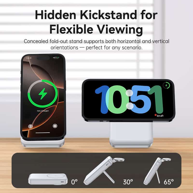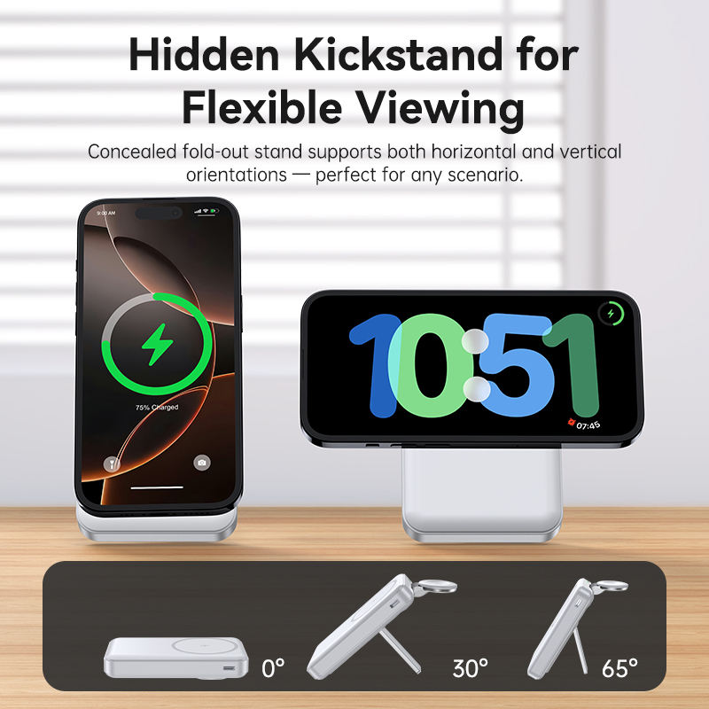 Experience the perfect blend of power and convenience. This magnetic power bank features a hidden kickstand that lets you place your phone at the ideal viewing angle while charging. Watch movies, attend video calls, or scroll comfortably — all while your device charges wirelessly and securely.